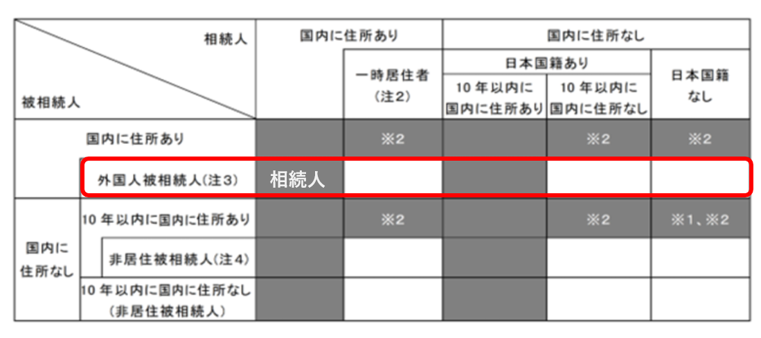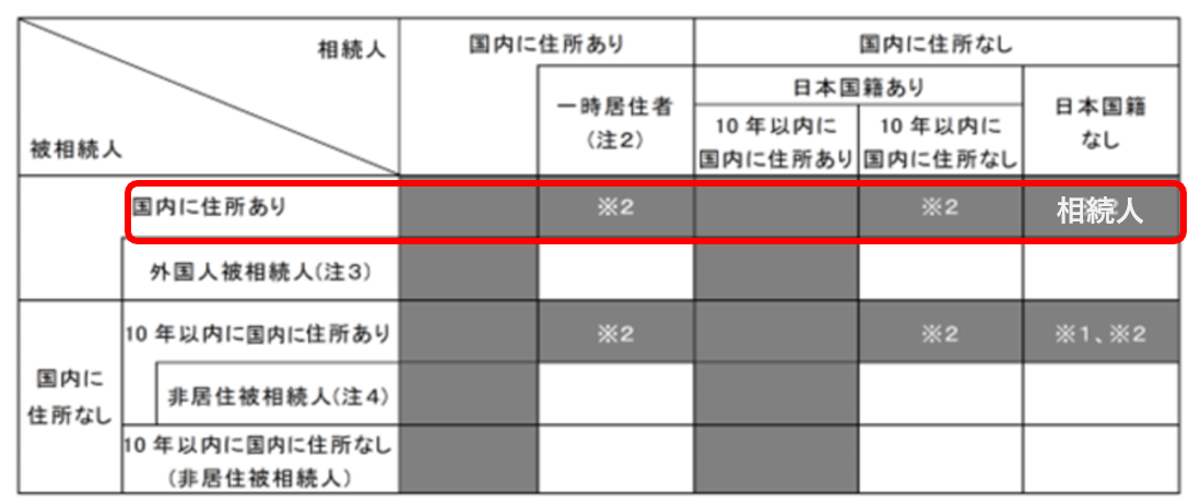 - 相続開始の時において日本の在留資格と国内住所を有していた人(上記表の注3に該当します)