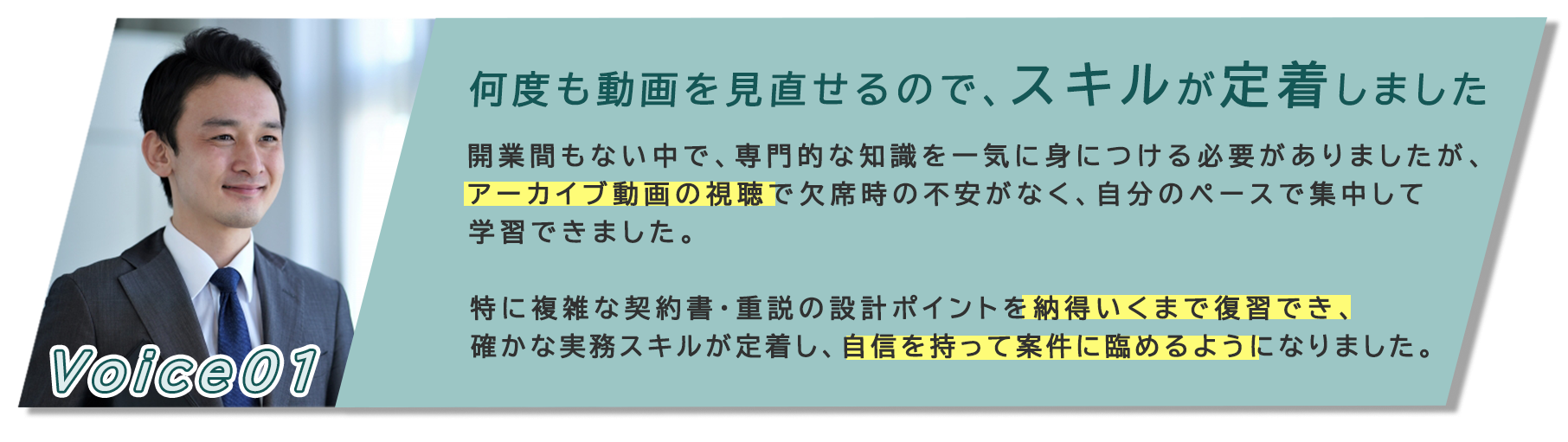 ご安心ください。一括申し込みされた方にはアーカイブ動画を全回分提供します。これにより、予習・復習が可能です。また、本講座は実際の契約書と重説の作成というアウトプットを重視しており、実務にすぐに直結するよう、段階を追って解説しますので、意欲のある方であればスムーズに習得できる構成です。