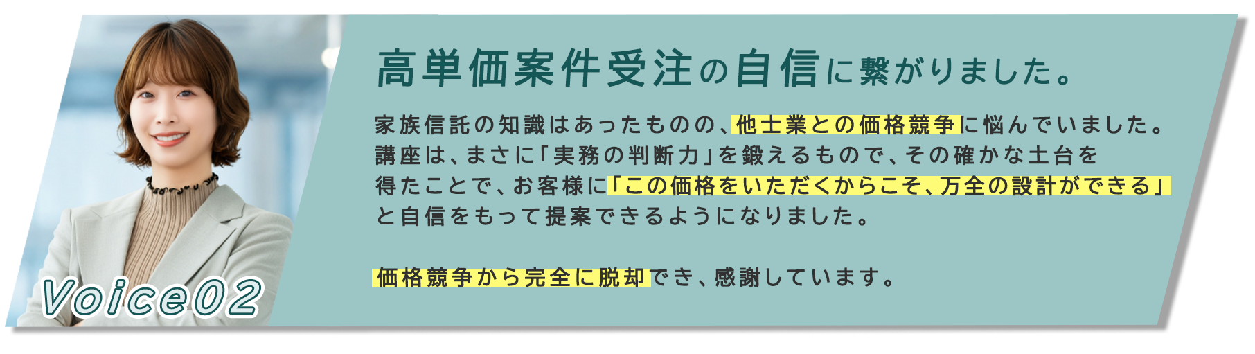 「なんとなく」で作った書類では、本当の「守り」は実現できません。 本講座で“守りの実務”が盤石になることで、初めて「自信」を持って高額なフィーを請求できるようになります。 ここで鍛えていただいた実務力で、価格競争から脱却し、専門家として選ばれ続ける存在になることができます。